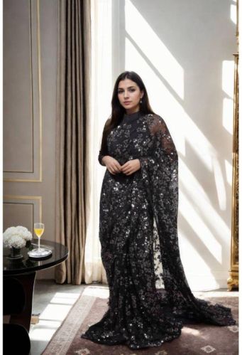 Midnight Elegance: Immerse yourself in the charm of nighttime beauty with this captivating black internet saree.