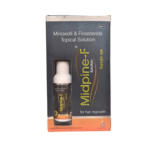 product name : midpine f lotionrncomposition : minoxidil 5% w/v + finestride 0.1% w/vrnpack size : 60mlrnpackaging type : bottlerntherapeutic category : anti-hairfall topical solution.