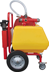 Designed as a self-contained mobile foam system for control and suppression of small flammable liquid fires - 40 gallon molded polyethylene tank with 4" foam fill opening - Aluminum frame construction with nozzle and hose storage ompartments, red epoxy finish - Heavy-duty rubberized wheels