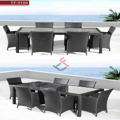 We are offering modern wicker six seat dining table set. tanfly rattan furniture 1. Aluminum frame 2. Rattan: non-recycled pe rattan, durable and uv resistant 3. Waterproof fabric cushion.