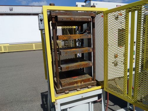PEBSCO ITEM #266 BANK OF 2- 15 TON HYDRAULIC MOLDING PRESSES MFG: PACIFIC WESTERN MANUFACTURING 2 ALIKE PRESSES W COMMON CONTROL PANEL ON UNITIZED BASE 5- 13” X13” ELECTRIC PLATENS PER PRESS 4- 5” DAYLIGHT OPENINGS PER PRESS 8” STROKE PER PRESS EXPANDED METAL ALL AROUND YELLOW SAFETY GAURDS PER PRESS PREVIOUS USAGE: MOLDING 2” TO 8” SILICONE SEALS OVERALL GOOD CONDITION 8” STROKE PER PRESS EXPANDED METAL ALL AROUND YELLOW SAFETY GAURDS PER PRESS OVERALL GOOD CONDITION