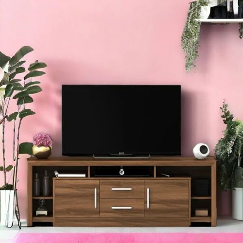 This TV console is crafted from premium engineered wood, ensuring durability and stability for your TV up to 55" in size. The sleek walnut finish adds a touch of sophistication to your living room, while the sturdy construction protects your TV from damage. Elevate your viewing experience with this high-quality console.