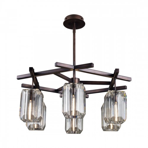 Chandelier in platinized silver leaf finish features modern sculptural blocks of polished, Emerald cut crystal glass. Also available in patinated bronze or soft gold leaf. Ships with bulbs and adjustable 6 foot rods.