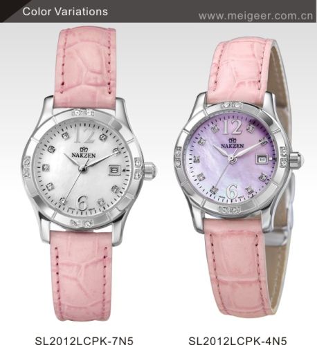We are offering mop dial colourful ladies genuine leather watches. 1.assessed watches supplier 2.316l steel case 3.beautiful mop dial 4.100% 5atm tested 5.two years warranty