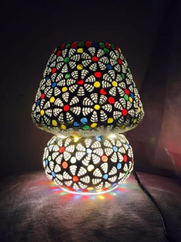 The work done on a lamp is handemade mosaic work. The black base will change into white base when it is not litted. It look very beautiful when it is off too . This can be place at any corner table or a dinner table of your home . It is very easy to maintain as it can be cleaned with wet cloth easily.