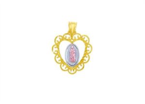 In the center of the Three Tone Plated heart Pendant is a image of the Mother Mary. There is a raised edge which leads to attractive swirl designs on the edges