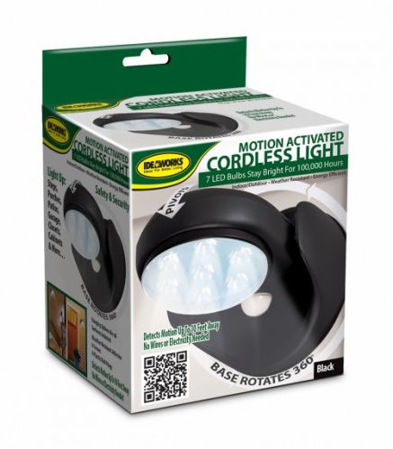 MOTION ACTIVATED LIGHT BLK 7 super bright LEDs. Adjustable to any angle for safety & security. No plug-in required. Detects motions up to 10 Feet away.Weather resistant. Stays lit for 30 seconds. Requires 4 AA Batteries (Not Included). Patent pending. ID JB7210 BRAND IDW-GNO CASE PACK 12 CASE WEIGHT 8.15 CASE LENGTH 14.3 CASE WIDTH 11.4 CONSUMER PACK COLOR BOX WHANG TAB CONSUMER PACK DIMENSIONS 5.25 X 4.25 X 5.88 UPC EAN NUMBER 017874013807