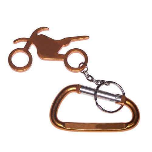 Motorbike shape bottle opener with key chain & carabineer. Value Combo! A great gift of bottle and pop bottle key holder! Great for racing and bikers! Solid aluminum construction with metallic color finish. Ideal for key holder, key tag, key chain, key ring, travel, sports and self promos.