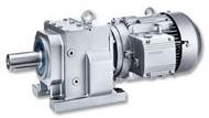 Helical geared motors are the conventional solution for your drive application. Helical gear units are coaxial units where the gear unit output shaft is in-line with the motor shaft. A solid shaft is always used as output shaft.