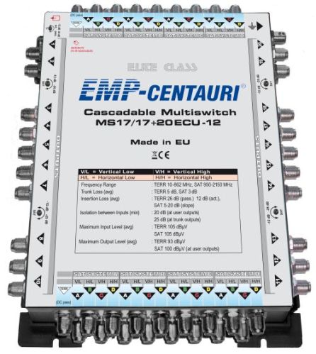 17in/17out+20 compact cascadable multiswitch for distribution terrestrial and satellite signals from 4 satellite positions (16 polarities) to 20 users. The multiswitch is DC supplied from connected satellite receivers, 2.1 socket for external power is connected to all satellite trunk lines. DC power is present at the TERR line, avoid short circuit! Using a rotary trimmer it is possible to switch terrestrial band fromactive to passive mode. The loss at user outputs in satellite band is adjustable by another rotary trimmer in the range 5-20dB. The attenuation at the outputs can be set by means of the trimmer together for each five outputs.