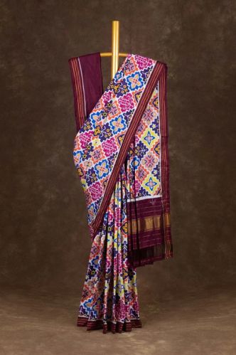 Contact SupplierIt is a riot of colours here. The saree wraps you in such amazing hues that you are reminded of the colourful and playful festival Holi. Wear it for your own good as it lifts your spirits and elevates your mood. The Patan Patola Silk Saree comes with all over floral design. The dark purple border sports smart stripes and the pallu too comes in dark purple and it is decked with gold zari and stripes.