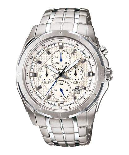 Four dials show day, date, month, and 1224-hour times at a glance. Popular large case 100-meter water resistance Face formed by layering one panel on another for a feeling of depth. Stainless steel case and band • EDIFICE logo stamped on the crown, back cover, and clasp Mineral Glass Screw Lock Back 100-meter water resistance Case bezel material: Stainless steel Stainless Steel Band One-touch 3-fold Clasp