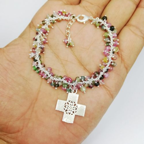 Silver Plated Multi Tourmaline Cluster Chain Bracelet with Silver Cross Charm – Beautiful Bracelet For Women and Girls – Charms Bracelet For Gift