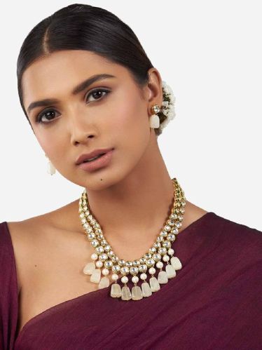 Contact SupplierMulti-layered necklace set with earrings made of hydro polkis, shell pearls and agate tumbles makes this kundan polki style so much well balance for a typical yet contemporary festive look like never before.