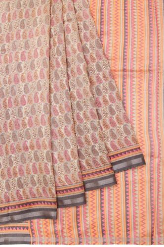 Contact SupplierLike a vibrant festival, this multi-coloured Chanderi Cotton Silk Saree is a joyous celebration. The multi-colored border with silver zari kaddi and temple design, the pallu with printed chevron patterns, silver zari stripes, and temple design, and the ash plain blouse with a border, form a lively mix. The paisley and flower butta on the body add a festive flair.