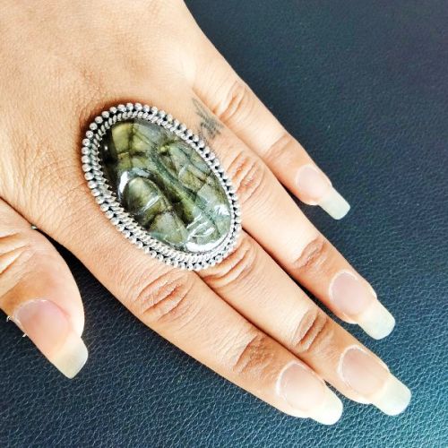 Metal:- 925 Sterling Silver Gemstone: Natural Labradorite - Carved stone Gemstone Shape:-Oval Head Size-46*31 mm Stone Size- 39*24 mm Finishing:- Shiny Silver