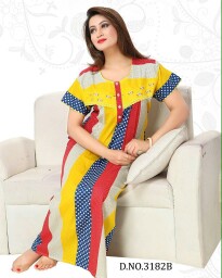 the ever got multy colored finised nighty. have just got up with a best monopolised material and the nighty patern. this is the nighty made with best stich quality and speciallised makers. we have all staff of special nightwears making. this nighty got a best and specialised finishing with multy color print. booking started