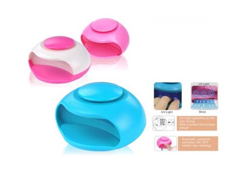 We are offering nail dryer. Features: with uv lights dry the nail oil within 2 minutes to get shiny nails touch switch to turn on, easy to use suitable for finger nails and toe nails specification: · power supply: 3aaa batteries (not included in the pacakge) · color: pinkgreen · unit packing: color box · dimension: 119*112*71 mm · gw: 0.18 kg · qty per carton: 40 units.