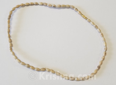 Neck beads (kanthi mala) of oblong natural Tulasi beads. Devotees of Lord Krishna traditionally wear beads made of Tulasi around their neck. Product Details Strung on tough nylon monofilament, with brass clasp. The long strand fits three times around most necks. Approximately