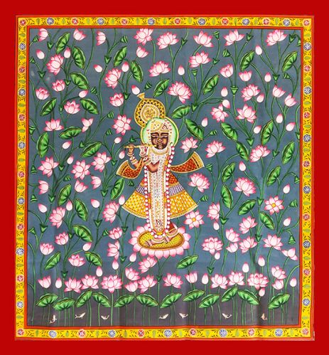 Pichwai with krishna in kamal talai is a very popular theme for pichwai paintings. This pichwai shows krishna enjoying monsoon amidst a pond of blooming lotuses. Lotus is often served as an offering to Krishna. Lotus depicts struggle in life, since it grows in muddy waters, yet remains pure and fragrant as ever. It is also said to bring in stability to a person.