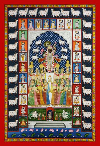 This Pichwai painting shows 24 different Shringars of Shrinathji in the temple at Nathadwara, Rajasthan. There are two outer frames, one with his favorite cows figurines. The inner frame shows 24 different shringars of thakurji, one for each fortnight.