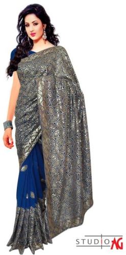 We are offering navy blue georgette embroidered saree. look elegant wearing this navy blue georgette embroidered saree. it is designed with zari, sequins work and heavy work designed border enhances grace of the saree. Matching blouse fabric comes with the saree.