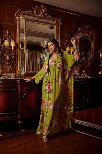 Crepe Nazrin Kaftan FOR WOMEN, Color : Lime Green