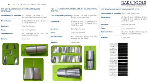 NDT STANDARD FLAWED SPECIMENS KIT ( MAGNETIC PARTICLE ) Total Number Of Specimen: [10] - 6 Plates, 2 Tee, 2 Pipe, 25 Random Placed Discontinuities Flaws. Kit contents : (6) Plates @ 6mm T, (2) Tee @ 6mm T (2) Pipe @ 100mm OD. Specimen: Plate, Pipe, Tee Joint Flaws: 2 to 3 each specimen Documentation: Document Includes CAD Drawings, Test Sheets & Radiographs Film Set. Material : Carbon steel.