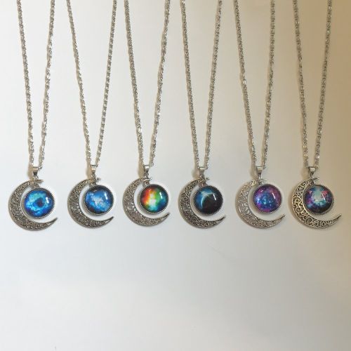 Silver lace moon crescent charm with nebula round cabs. Left to right: - Oxy Black Hole - Nighttime Blues - Nebula Color Spectrum - Eclipse - Violet Vector - Heaven Lights
