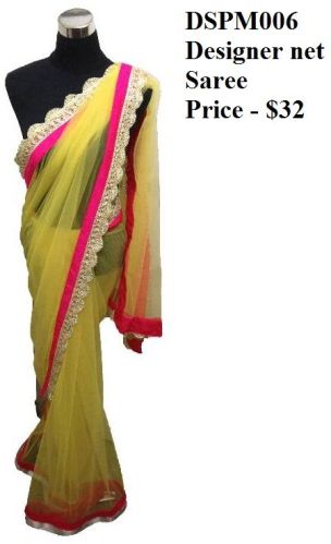 We are offering yellow color net designer saree with pink and gold color border with pink unstitched satin blouse material 1 mtr. If required we will arrange stitched inskirt
