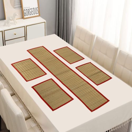 newyear ready handcrafted korai mats table mat runner set manufacturer exporter wholesaler handcrafted river grass 12 x 18 inches red border 4 seater dining table place mats with 12 x 60 inches runner for home, office party mat, café table mat, restaurant mat, gifting mat