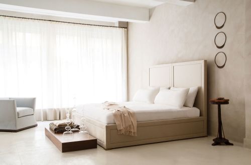 NOMA BED DIMENSIONS King W83 L87 H60.5 COM 20 yards Queen W67 L87 H59.5 COM 18 yards DETAILS - Inset upholstery panel detail - Architectural bronze or solid steel feet - Platform construction SHOWN IN - COM - Architectural Bronze feet in Natural finish NOTES - 60”W fabric is required for seamless headboard upholstery. Minimal seaming added at rail height for fabrics under 60”W. - Additional feet finishes available - All sizes can accommodate a 9”H boxspring (client provided or D&CO’s custom boxspring, by request) Made to order | Custom options