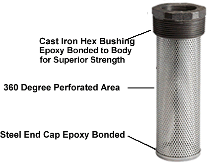 Cast Iron Bushing • Flow rates to 100 gpm • Zinc plated perforated steel Mounting and Operation: Can be mounted vertically or horizontally. Can be highly effective in reducing aeration, foaming, turbulence and noise caused by return lines.