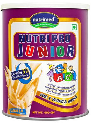 Nutripro Junior is a complete and balanced nutrition supplement for children of the age group (2 years and above). It has a perfect blend of 32 vital nutrients. It is scientifically designed nutrition supplement which helps support overall growth and development of children. Premium Blend of Whey+Milk Protein with DHA iron and iodine. Contains 32 vital nutrients Supports brain development For overall growth and immunity 100% vegetarian source