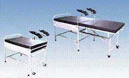 DELIVERY BED (SI-1097) Approx. Size-Body section-1000L x 800W x 750H mm, Leg Section- 900Lmm. Bed, Labour and Delivery made in 2 section, body section with legs mounted on rubber tips, Leg section swivel castors with brakes. Leg section can be completely recessed under the body section. Supports for legs holders with solid mechanism to fix leg holders at requested height & width. Filled mattress-pad and cover mattress pad in 2 sections. Supplied with 2 knee crutches adjustable in height & width. Knockdown construction. Epoxy Powder Coated finish.