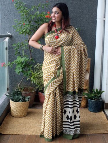 Contact SupplierBagru Dabu hand block printed pure mul cotton saree with chevron print. Pure mul cotton. Length: 6.32 mtrs including blouse piece. (5.44 mtrs Saree) With: 44 inches. Blouse piece length: 88-89 cms. Naturally hand dyed and hand block printed. Washing and care Hand/ machine wash with like colours in cold water. Do not soak. Line dry in shade. Disclaimer: All images have been taken in daylight. The colours are closest to the actual colour of the saree, however, slight variation in the tone/shade made be noticed due to camera exposure setting and viewers display settings.