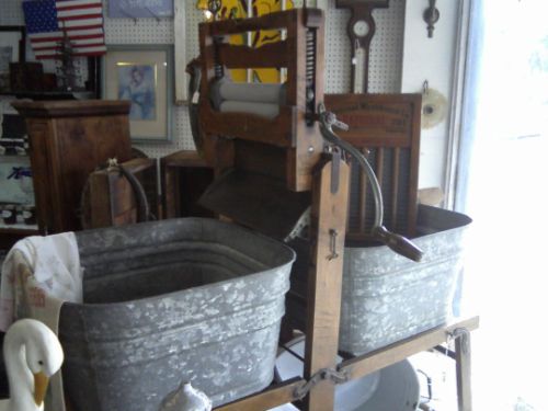 Antique and Complete is the best way possible to describe this old ringer washer. The preservation of this unique piece can be attributed to the fact that it was kept indoors for all these years. The hardware is in as good a shape as it was the day it was sold brand new. Zinc tubs and washboard are included to make this a complete and ready to use or to display piece. One would be hard pressed to find any similar piece in this pristine condition.