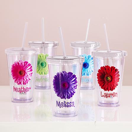 A Personal Creations Exclusive! This bright and sunny acrylic tumbler keeps drinks frosty cold inside, but won’t sweat it on the outside. Choose pink, red, purple, aqua or green tumbler with flower design. We add any name, up to 9 characters. Cup features a screw-top lid and comes complete with a reusable drinking straw. BPA free and FDA approved. Holds 16 oz. Hand wash. Item