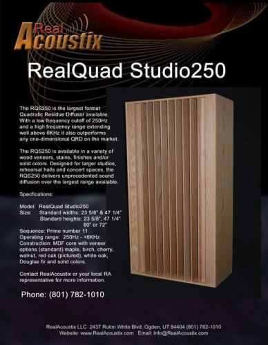 The RQS250 is the largest format Quadratic Residue Diffuser available. With a low frequency cutoff of 250Hz and a high frequence range extending well above 6Hz, it also outperforms any one-dimensional QRD on the market. Designed for larger studios, rehearsal halls and concert spaces, the RQS250 delivers unprecedented sound diffusion over the largest range available.