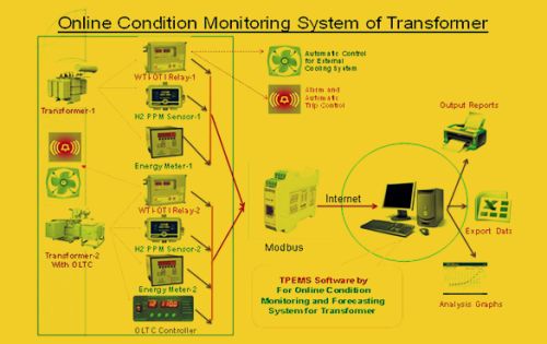 For giving the solution of same we have introduced a system which helps in condition monitoring of power and distribution transformer. All the equipments have MODBUS communication protocol and are linked to server which has powerful analysis software to estimate the extent of deterioration and effect of failure on real time basis.