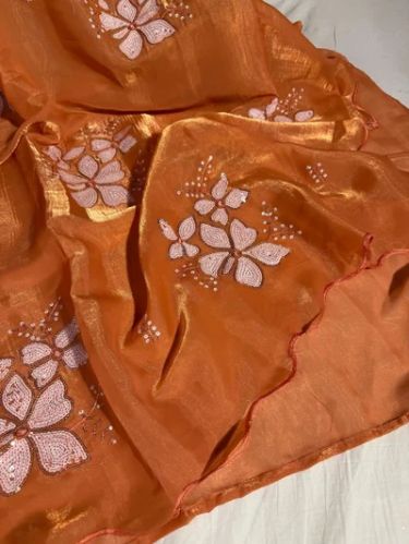 Contact Supplierorange shade shimmery tissue silk designer saree with threads sequins work fabric- shimmery tissue silk saree length - 5.5 mtr care instruction- dry wash only work- lace work in saree , embroidered work in blouse note- saree color may vary because of different screen resolution and lighting note- ready to wear saree which will be customised will not be taken return for return:-(opening video is compulsory)