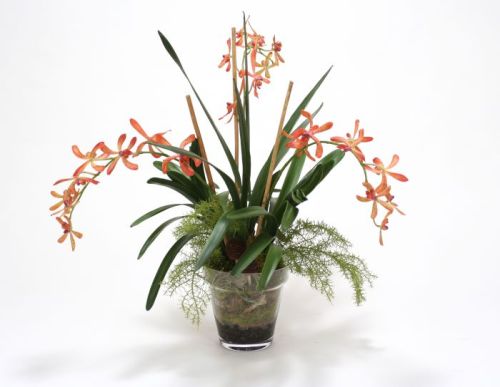 9854# - Orange Vanda Orchid with Orchid foliage in Glass Flower Pot Container Material Glass Dimensions Height" x Width" x Depth" 28 x 32 x 26 Dominant Color Salmon Dominant Color Family Oranges Shipping Weight 12 Ships