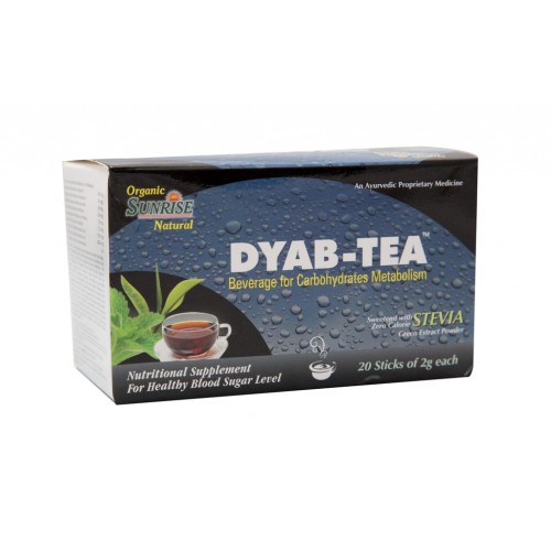 Organic Sunrise Natual Dyab Tea is a matchless Ayurvedic blend of herbs that helps body metabolism sugar by stimulating insulin production and improving the sensitivity of peripheral insulin receptors. The main ingredients of Organic Sunrise Natural DYAB TEA, Gumar, Banana, Vijayasar and cinnamon were found to act like conventional hypogilcemic agents. According to ayurveda Punarnaba & Ashwagandha help body fight diabeties by strengthening Liver & Kidney by flushing out impurities from kidney cells and liver. Research suggests that in diabeties there is oxidative stress in combination with reduced antioxidant status; this results in greater vulnerability to the damaging effects of free radicals. Powerful antioxidants of organic Sunrise DYAB TEA such as Green tea, Black tea, Vijaysar and Ashwagandha decreases oxidative stress and improve antioxidant status.