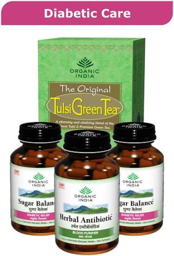 diabetic care kit from organic india includes sugar balance, herbal antibiotic and tulsi green tea.