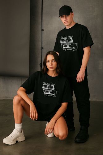 Contact SupplierUnisex black graphic t-shirt with bold eye print and quote: “The eyes chic, they never lie.” Made from premium cotton with an oversized fit for ultimate comfort and streetwear style. Note: Price is for 1 piece only. For couple t-shirts, please add 2 items to cart.