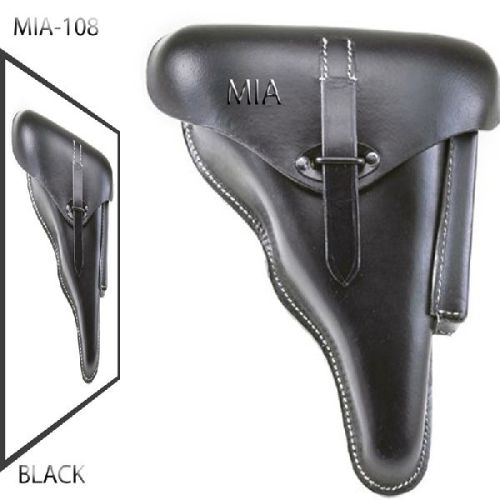 reproduction of german wwii p38 hardshell black leather holster p38 hardshell holster dated 1942 high quality black leather construction expertly handcrafted replica.