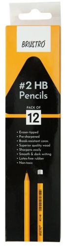 Brustro #2 HB Pencils are made of graphite with an accurate bonding process making them break-resistant and easy to sharpen. They are smooth on paper and give dark writing which is easy to erase. The eraser at the tip is made of latex-free rubber making the pencil non-toxic and safe for children. Ideal for school and office use. Eraser-tipped. Pre-sharpened, Extra dark. Break-resistant cores. Made of wood Sharpens easily. Smooth and dark writing Latex-free rubber. Non-toxic