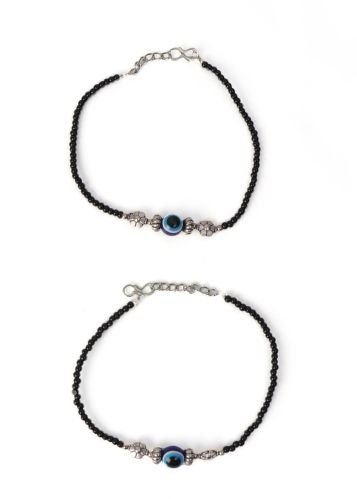 Enhance your style with this pair of German Silver Flower Anklets, featuring Evil Eye motifs and Black Beads. The intricate design combines elegance with protective charm, making these anklets a perfect accessory for any occasion. Specifications: Type: Anklet