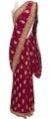 This saree is timeless and luxurious. On a deep maroon base it has woven gold paisleys all over. A combination of gold dori & tonal red is used for fine embroidery detail. Unstitched matching blouse fabric is attached with the saree. Fabric- Georgette Colors- Maroon & Gold