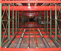 Pallet flow racking uses flow rails with speed controls mounted in standard pallet racking to allow pallets to move by gravity from the loading end to the unloading end. As a load is removed, the loads behind it move forward to the unloading position.